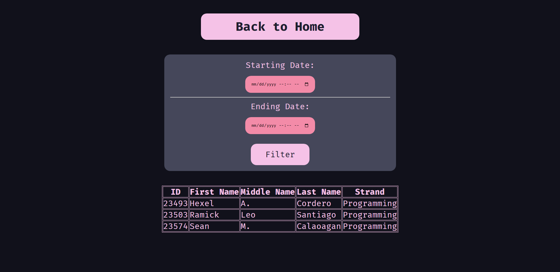 C.R.O.N.O.S (Check-in Record Organizer for Notifications and Overview of Students) - This is my most “advanced” website to date. This website was done in fulfillment of my Programming Languages 2 subject, and our teacher specifically assigned this task to my group. It is an attendance checker, wherein a QR code scanner automatically inputs the student’s ID number into the field, registering the student as present on that day. It also has a built in tracker, where one can search for the students present during that time. This website utilizes Java with the Spring boot framework, Tomcat, and XAMPP.